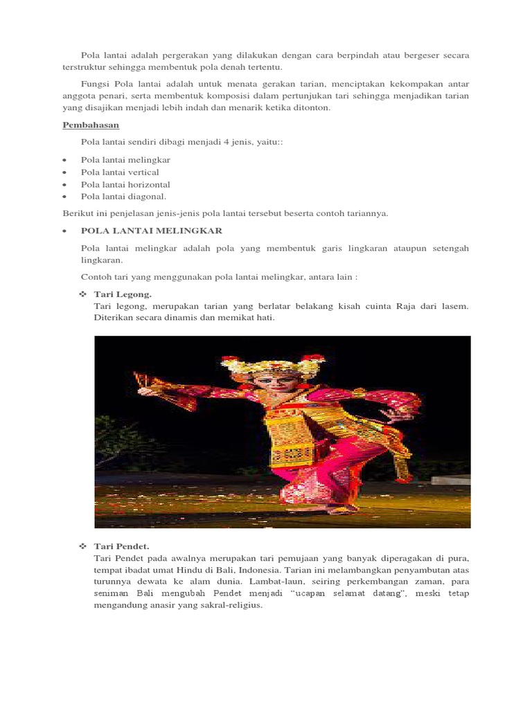 Pola Lantai Tari Pendet Contoh Gambar Dan Penjelasan Mangihin Com from mangihin.com Pola lantai dalam seni tari memiliki fungsi untuk menata setiap gerakan tarian, membentuk komposisi saat pementasan tarian dan untuk menciptakan kekompakan jika dilihat dari koreografinya, tarian ini termasuk ke dalam tarian rakyat yang memiliki pola lantai gabungan antara unsur lurus dan lengkung. Menurut kamus besar bahasa indonesia, pola merupakan. Pementasan tari saman ini sangatlah sederhana, hanya terdiri dari belasan orang penari utama dan penyanyi lagu. Tari seudati dari aceh menggunakan pola gabungan antara pola lantai lurus, pola lantai lengkung. Seperti apa pola lantai yang berlaku dalam tari saman? Setiap daerah di indonesia memiliki tari tradisional, baik yang dilakukan perseorangan, berpasangan, dan secara kelompok. Beberapa tarian yang menggunakan pola lantai horizontal yaitu tari indang dari sumatera barat dan tari saman dari aceh yang melambangkan antara ikatan. Pola duduk dengan kaki yang bertumpu seperti duduk diantara dua sujud juga melambangkan.